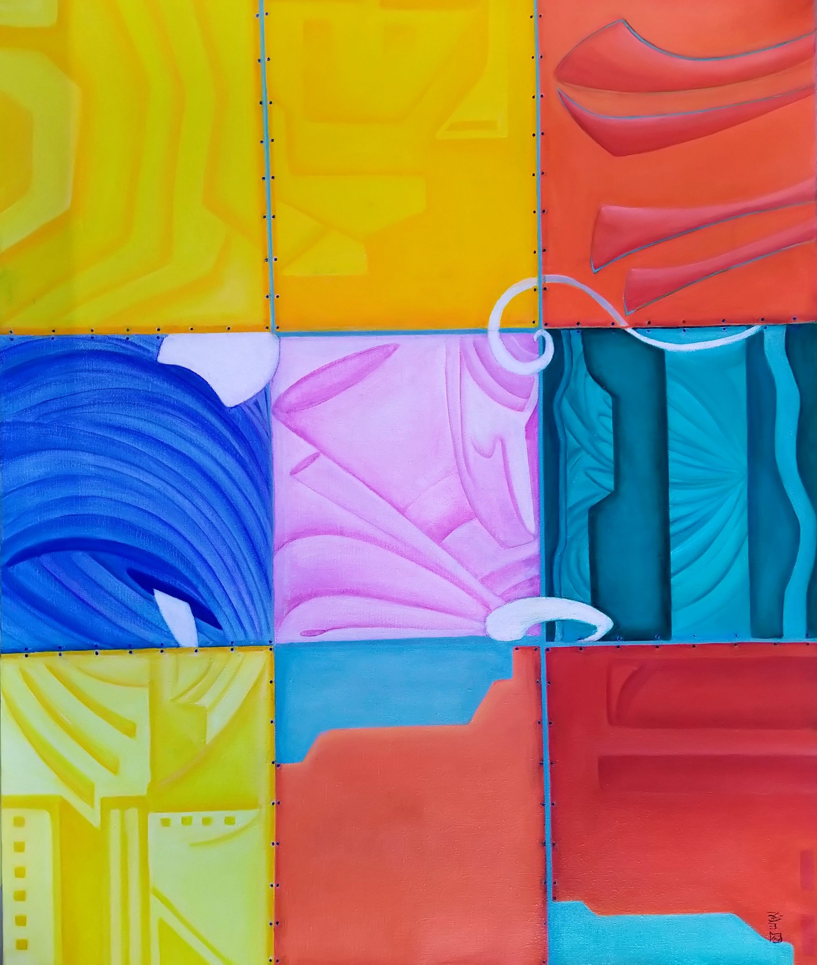 Oils&fluorescent colours on linen, 74.5x68cm.